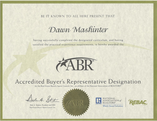 The ABR® designation is onlyawarded to licensed real estate professionals who complete specialized training that gives them the edge in understanding a buyer’s perspective and protecting and promoting their buyer-clients’ interests. Before earning the ABR® designation, buyer’s reps must also demonstrate proven experience in representing buyers. Further, they are committed to maintaining their professional edge by staying current on the latest issues and trends in buyer representation.